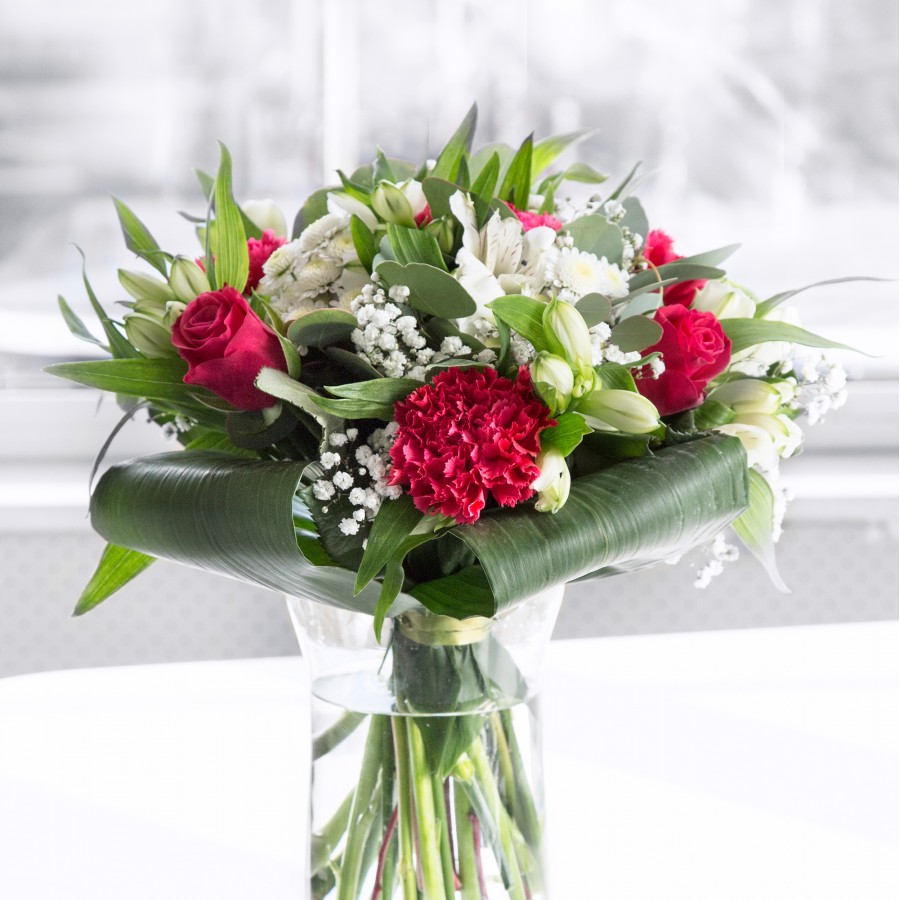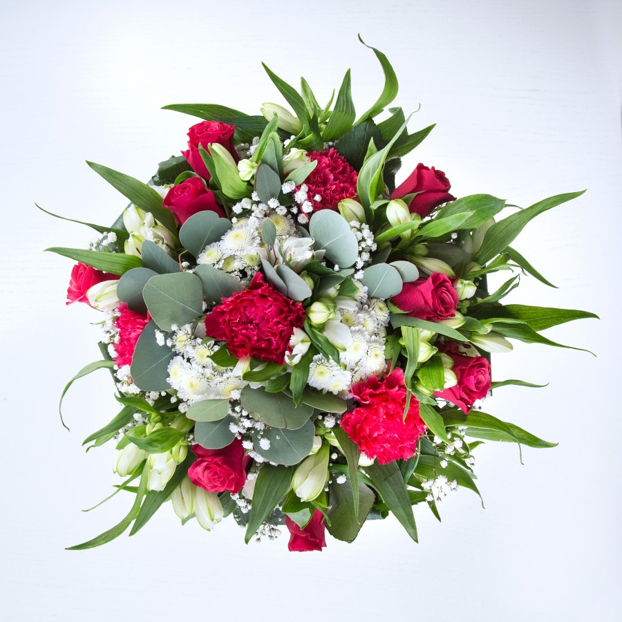 The combination of red roses and white chrysanthemums is just perfect. My partner loved it!