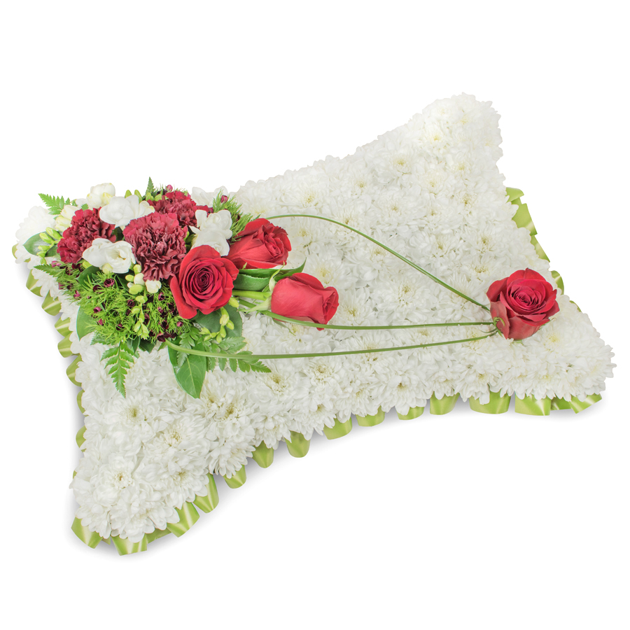 Express your deepest condolences with the Sincerest Sentiments Cushion, a graceful funeral tribute handcrafted by Flower Delivery Stevenage. This elegant cushion features a soft base of white chrysanthemums, thoughtfully accented with rich red roses, delicate white freesias, dark red carnations, dianthus and looping bear grass for a refined finishing touch. Designed to convey sympathy, love and respect, this floral cushion is ideal for funerals, memorials or as a heartfelt gesture to grieving family and friends.